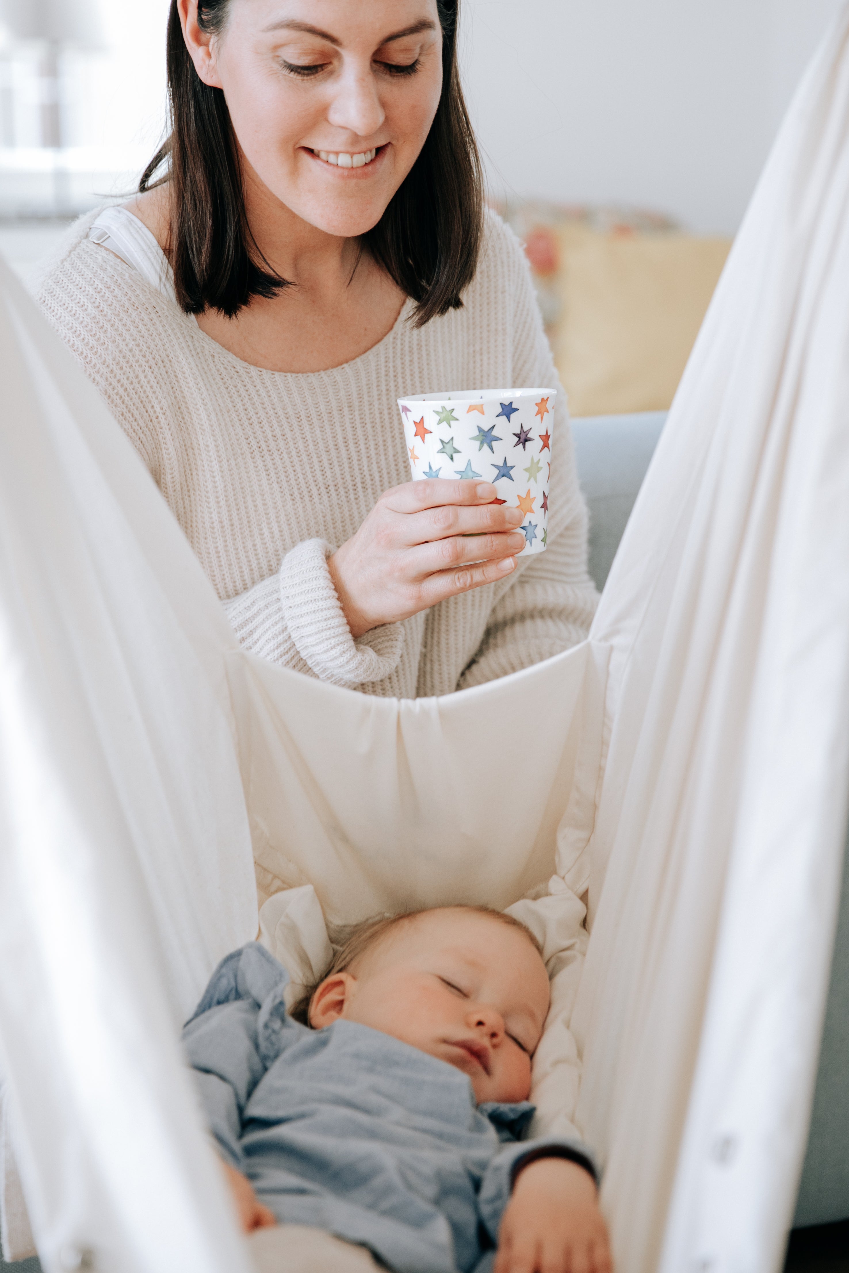 Du kannst dein Baby bereits ab der Geburt in die Swing2Sleep-Baby-Hängematte legen, vorausgesetzt es wiegt etwa 2,6 kg. Diese ist bis zu einem Alter von ca. 1 - 2 Jahren oder einem Gewicht von 15 kg (für Smarla 18 kg) geeignet. Die Hängematte unterstützt direkt nach der Geburt die natürliche, gerundete Haltung des Rückens deines Babys, indem sie die im Mutterleib gewohnte, gebeugte Position simuliert. Diese ist nach der Geburt noch etwas gekrümmt, was als Totalkyphose bezeichnet wird. Daher ist es wichtig, dass der runde Rücken eines Neugeborenen gut gestützt wird. Dies fördert eine gesunde Entwicklung der Wirbelsäule, die sich allmählich bis zum Laufalter deines Kindes streckt. Außerdem bietet die Babyhängematte ein kuscheliges und gemütliches Nest, in dem Du Dein Baby vor Reizüberflutung schützen kannst.. Die Swing2Sleep-Hängematte dient vor allem als Hilfsmittel zum Einschlafen und sollte nicht als permanenter Ersatz für ein Kinderbett genutzt werden.